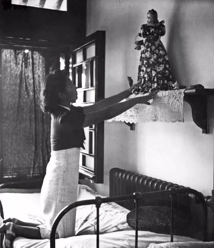 这只穿花裙子的玩偶是宿舍里的小摆件,女生踮脚把它放到绣着蕾丝边的木架上,窗外的光从纱帘缝里溜进来,照在娃娃的玻璃眼珠上亮晶晶的,妈妈看了笑,说那会儿姑娘们也爱收拾屋子,床头要有一件“显眼包”,每天睁眼就能看到,心情立马开了花。