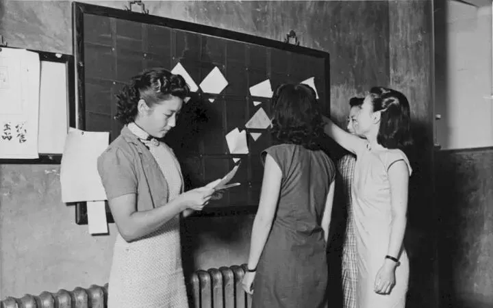 这个墙上的网格叫邮件栏,木框一格一格,夹着三角折的信笺,边上是公告黑板,手里拿着纸条的女生正在对号入座,谁的信谁去拿,信头写着“亲爱的”或“某某同学”,现在信息一秒到,快是快了,可一张信纸的重量,能把一天都按得稳稳当当。
