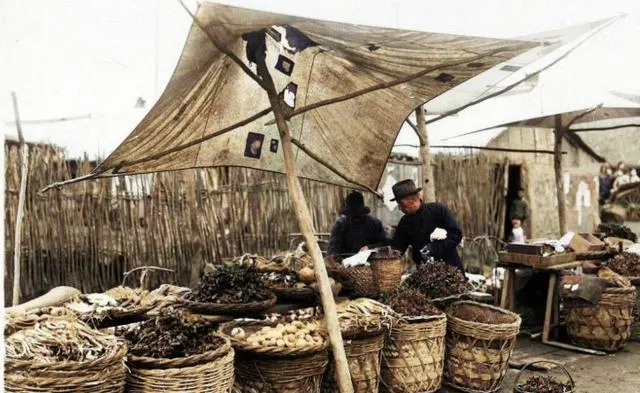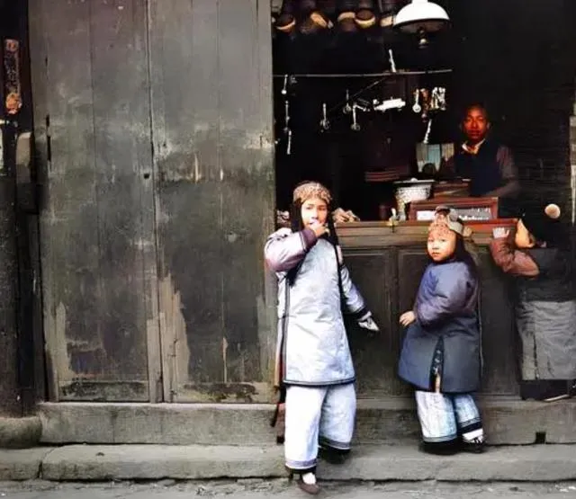 图中这间黑门脸的小铺,柜台后摆着秤钩铜碗,两个孩子穿的是粗棉袄加夹板鞋,袖口鼓鼓的全是棉絮,那会儿买糖要伸手到玻璃柜里点,掌柜抬眼一瞧就知道谁家孩子,冬天里门口多半吊着风灯,风一灌进去,屋里那点炉火味就顺着出来了。