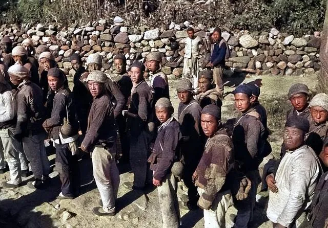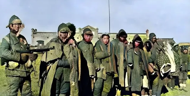 这一串脸通红是冻的,鼻尖结霜,破棉袄里塞着草,手被绳攥着,队伍前面的冲锋枪黑着脸,天色刚亮,心却是黑的。