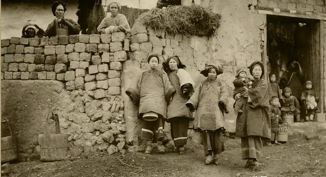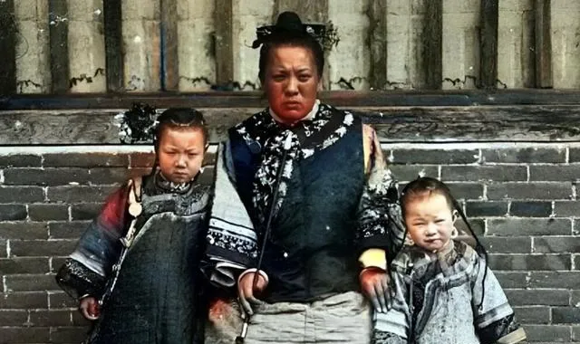 这位娘们穿的是滚边大襟,腰上围着绣花肚兜,两个孩子眉头都皱着,冷不冷她心里最清楚,站墙根儿背后就是风,相机一响,脸上那股倔就被钉住了。