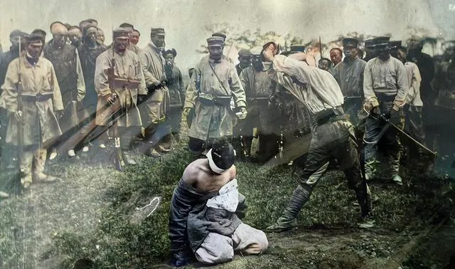图上这排膝盖跪在草上,背后站满了制服,手里的木棍和枪都不抖,镜头里看不见的,是旁边人装作没看见的目光。