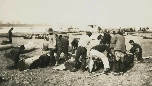 一群人围着原木刨槽,斧头起落有节奏,锯末子飞起来在阳光里亮,裤脚全是泥,收工得靠吆喝,谁也不甘心先停。