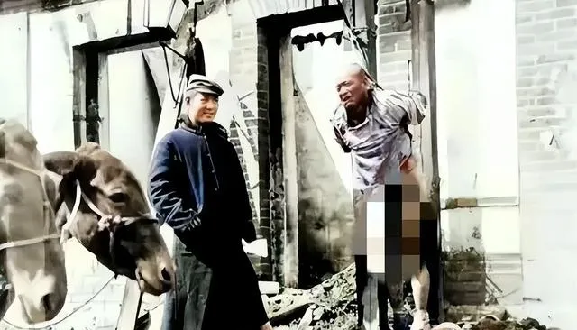 这张最扎眼,裤子被扯下,绳子勒得肉陷进去,旁边人装着闲站,驴子在一旁喷白气,寒碜两个字都不够用,这不是戏,这是活生生的街口。