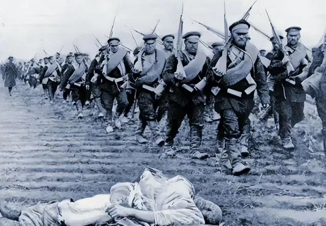 一排跨着刺刀从尸体边踏过去,脚步齐齐的,脸绷得硬,地上那具身子没名字,风吹着衣摆像在说话。