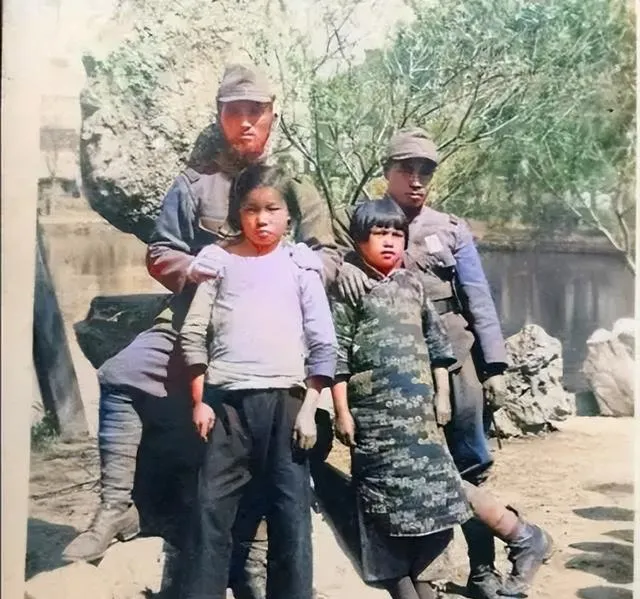 两个兵站在石头旁边,脸上糊着尘,两个孩子衣服肥大,袖口垂着,镜头怔住了那一刻的生分,像隔着一堵看不见的墙。