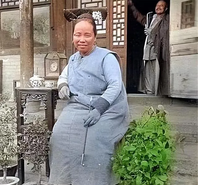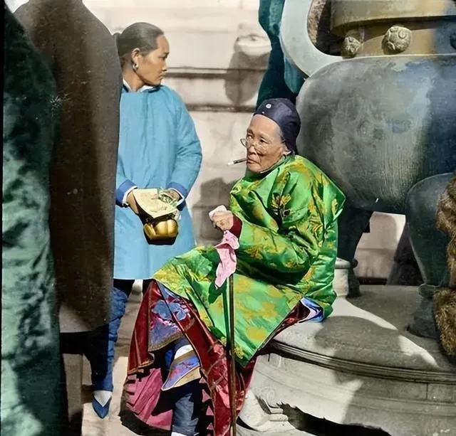 图中这位披着缎面绿褂的老太太叫太太娘子也有人喊老夫人,旁边提铜壶的是贴身使女,老夫人手里攥着烟袋杆,袖口翻着粉色绸边,坐在石墩上眯着眼,像是在打量谁,奶奶说她们讲究的是“坐稳”,一身衣裳就是靠山,衣角一放,谁都不敢插嘴。