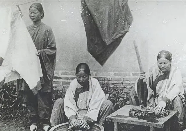 这三位是院里干活的洗衣婆子,左边撑杆晾,右边木槌捶,中间一只木盆里全是冷水和皂角沫,动作麻利,脸上却没什么表情,小时候我在乡下看过舅妈捶衣,木槌一下下落在湿布上,像敲鼓,冬天的水可真扎手。
