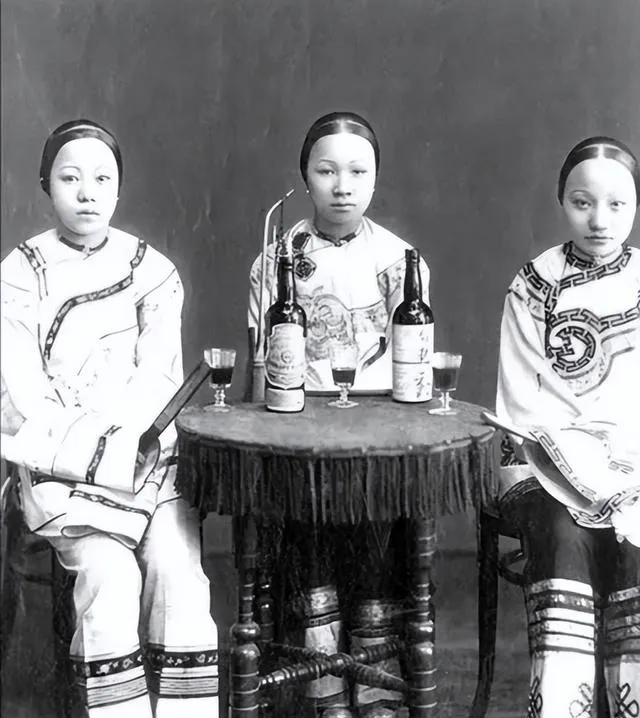 桌上两瓶洋酒三只高脚杯,图中三个小姐穿旗装坐得端正,中间那位嘴里叼着细烟,玻璃杯里半指红,妈妈说那会儿城里头见新鲜快,洋货是面儿,喝没喝懂不重要。