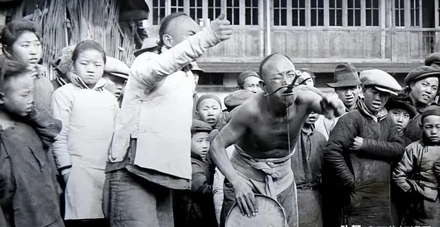 这一位是江湖艺人,嘴里正往下咽钢片,旁边搭档捉着锣一通吆喝,围观的孩子伸着脖子看,爷爷说他们吃的不是饭,是胆子,挣的也是看客的一时兴起。