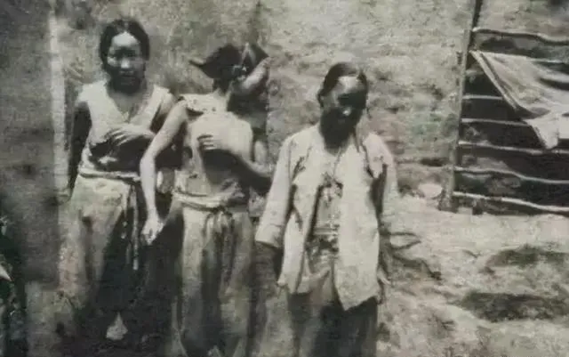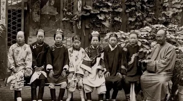 清末老照片:小妾坐一溜,宫女站一排,穷苦人家挤院子里吃一道菜。