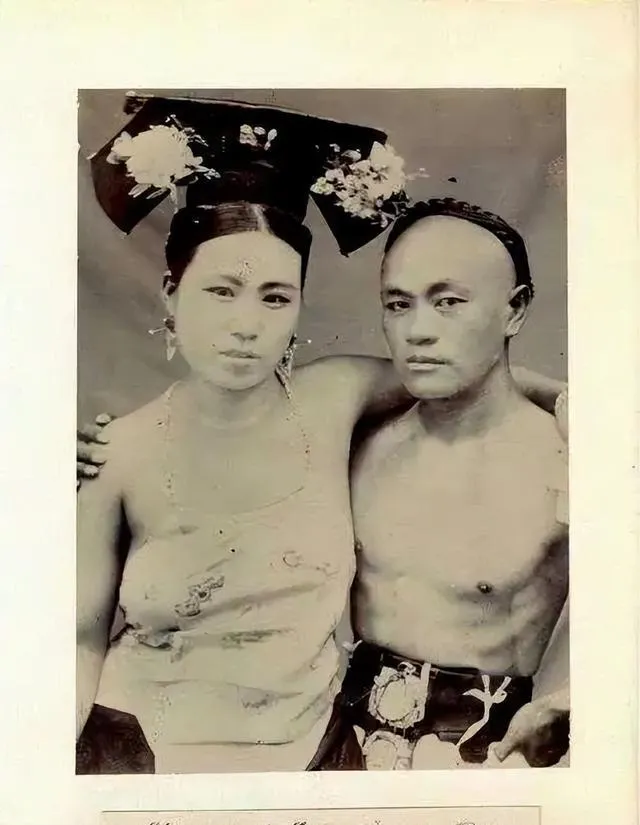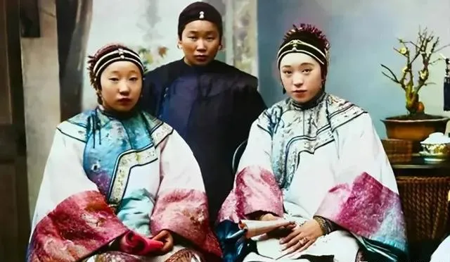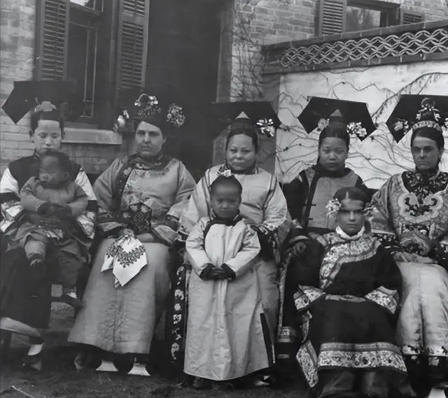 这排里有几位面孔是洋人,头上戴着大翅子,身上是旗装,坐得倒是规矩,可怎么看都有点别扭,像是戏台上换错了戏服,那会儿租界里流行这个,算是“入乡随俗”的样子吧。