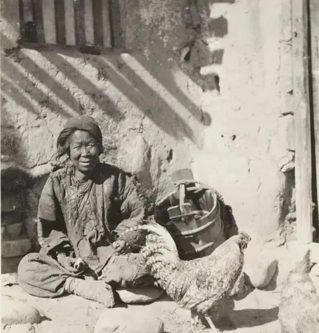 这个坐在墙根的妇人,怀里抱着篮子,脚边一只家鸡,她笑得有点傻气,鸡倒是警觉得很,奶奶说鸡蛋卖了换盐巴,自己舍不得吃,家里人挤在院里,一锅里一道菜转着吃,口水都要分给谁似的。