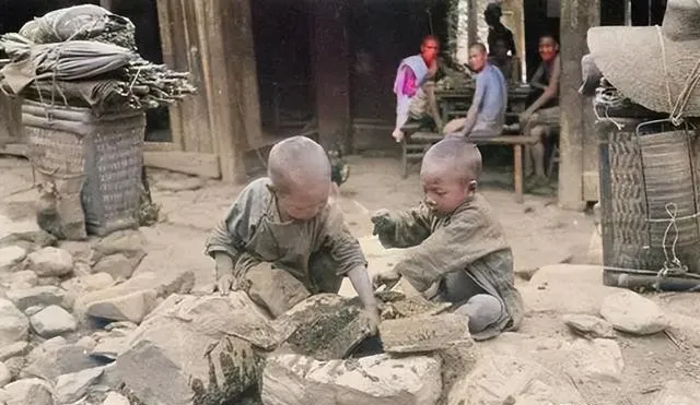地上是破石块和泥巴,两个小孩玩得认真,一个扒一个敲,后头木架子上压着衣裳,堂屋里坐着的大人不抬头,穷家孩子的玩具不是买的,是捡的,可也玩出了整整一个童年。