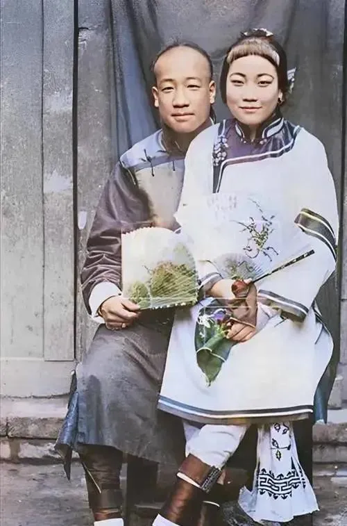 这对小两口穿着旗装,手里举扇子,脸上有点紧张,镜头一亮,时代就落在他们身上了,爸说那时照相是件要事,先洗脸再梳头,连笑都得练。