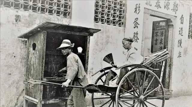 这辆两轮的叫黄包车,前面汉子勒着踏杆,后面坐的是客人,车夫肩头布带勒出深印,停在路边喘两口,客人手里摇着扇子不慌不忙,外公讲他年轻时拉过短活,最怕上坡,一路牙缝里就剩风。