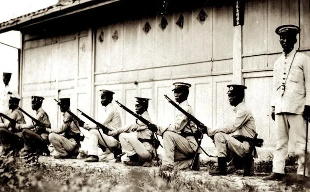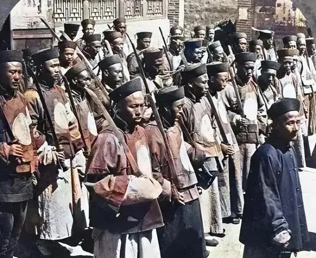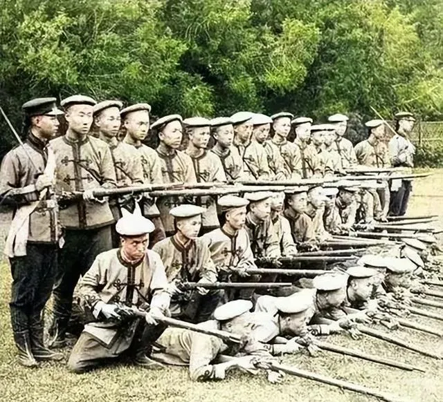 这几张是兵的照片,新军跪姿上肩,枪口一线穿过去,旁边团练衣襟上一个大圆补子,表情紧着,地上草还带露水,师傅拍腿喊口令,爷爷说以前扛的是刀枪,现在图里是一排步枪,时代拧了一下,力气就变了方向。