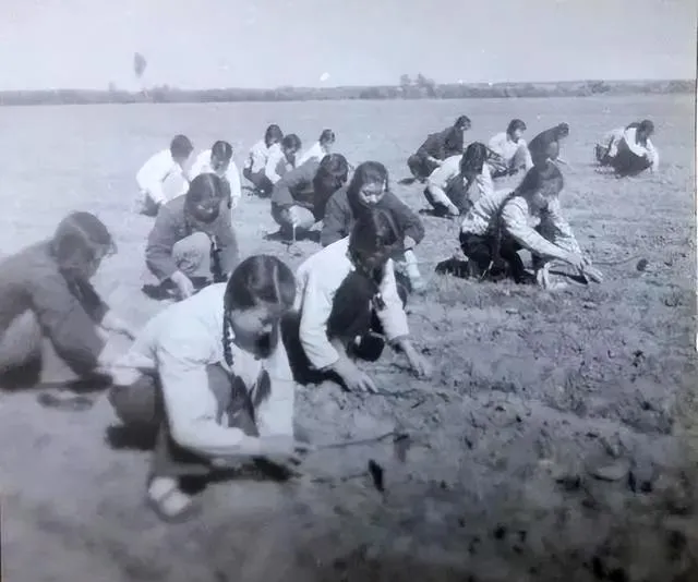 图里这排黑乎乎的锄头叫老把式锄,人手一把,木柄糙手却耐造,铁刃磨得发亮,开春第一遍中耕就靠它,喊一声号子,齐刷刷下锄,土浪翻起来像鱼鳞,队长在前面划行,后面的人对着脚印走,既整齐又不误工。
