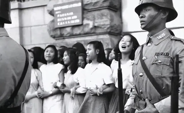 这一队女学生穿裙装站成一排,旁边站岗的士兵背带勒得笔直,妈妈说那会儿上学不易,课本新,心也新,可路口常有哨兵拦着查证。