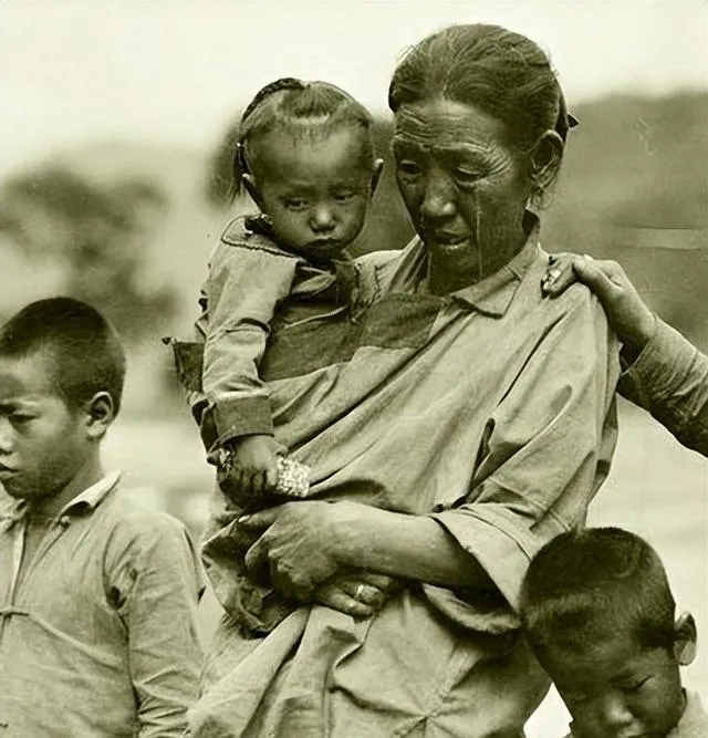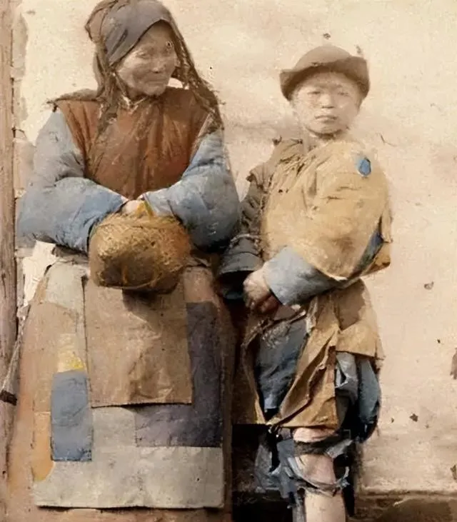 这个场景最常见,长衫老者拄拐杖,妇人穿粗布短褂,女孩套一件西式短裙,东西方的穿法混在一张底片上,就是那个年代的折衷味道。