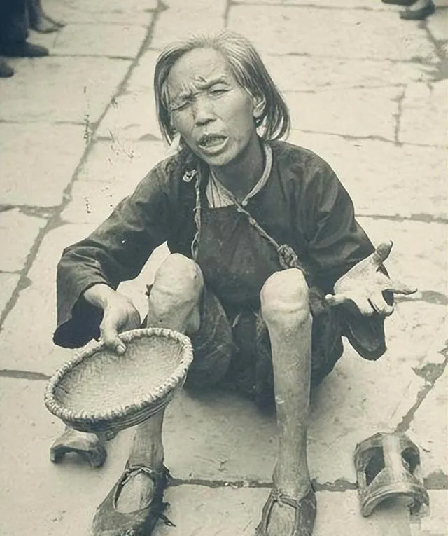 竹编盘子叫化碗,鞋面开了口子还用麻绳捆着,她张嘴说话,嗓子发干,旁边倒着一只木脚窝,像是她一天的脚程。