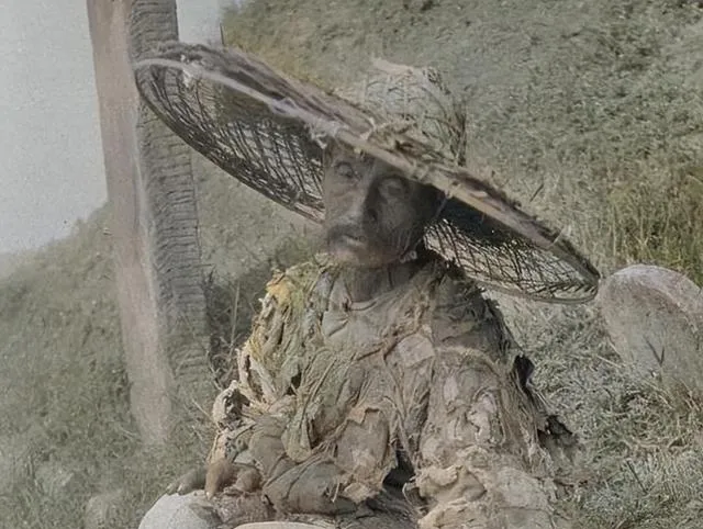 这顶大草帽边沿塌下去半圈,人身上披的是树叶缝的披风,像从田埂里长出来,远远看过去,人和野地搅在一处。