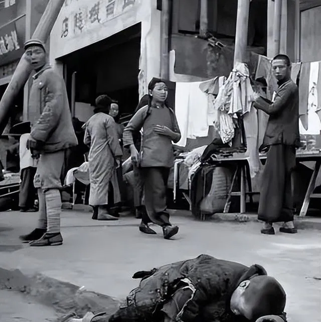 画面里人来人往,摊铺挂着衣裳,一个黑影倒在路边,没人敢多看一眼,大家都忙着过自己的日子,这种冷,是那会儿常有的底色。