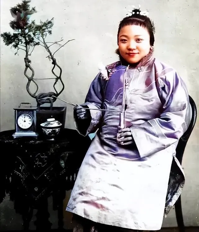 她手里那根长长的是烟嘴,紫缎袄子光可鉴人,桌上放着怀表和茶盅,盆景是蟹爪梅的盘扎,姿势里全是讲究,镜头却捉住了一点天真。