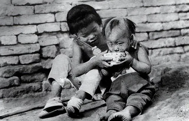 背后的横幅是劝善的字句,两个孩子衣裳肥大,裤腿上油点子干成疤,鞋是绳皮串的,站着发呆,像在等一个从来没来过的人。