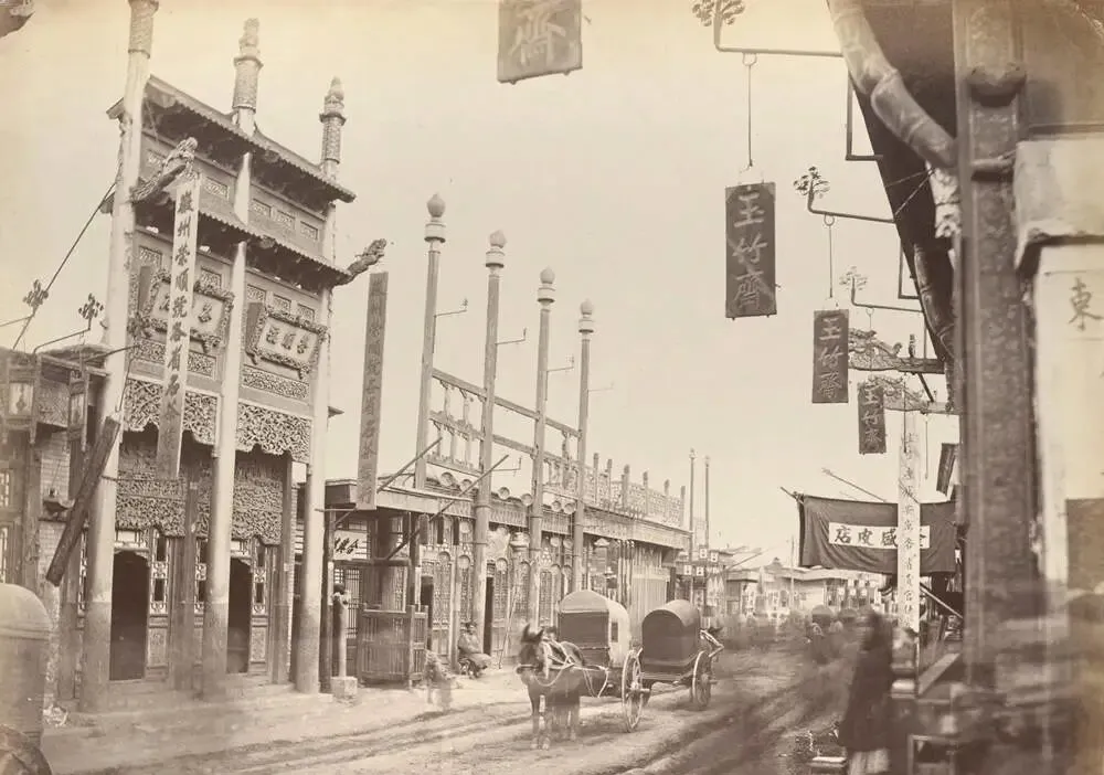 图中这一排门脸叫老北京的商业街,木作雕花厚实,檐下挑杆挂着幌子和灯笼,招牌上药铺、饽饽铺、南货几个字一溜儿排开,路心是两道车辙,泥巴被马车车轮搅得发亮,小时候我跟着爸爸进城买药,他就指着这种门口的木栅说,认幌子不认门牌,哪家幌子大,哪家手艺硬。