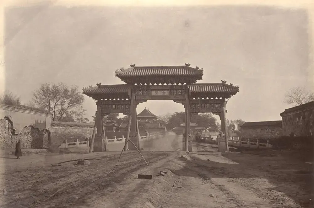 这个隆起的门叫金鳌牌坊,四柱三间,瓦当整齐,过了它往左是中海,往右是北海,照片里路面还是土,旁边的矮墙已经脱皮,掉了一块又一块,气派和破败就这么挤在一块儿,像把旧朝气门芯翻出来给人看。