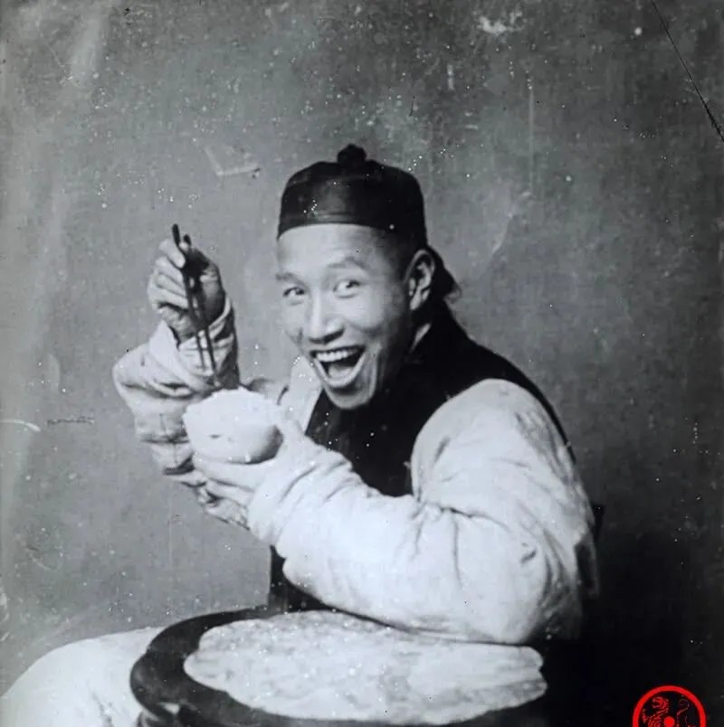 这个大碗里装的是松松软软的白米饭,图中这位笑得见牙不见眼,筷子一挑就往嘴里送,衣袖鼓鼓的像枕头,家里人爱逗我说,吃饭就要有这股子开怀劲儿,别抠抠搜搜,能吃是福,那时候粮食金贵,能端起一碗白米饭就已经是好日子了,现在花样多了,胃口倒挑了。
