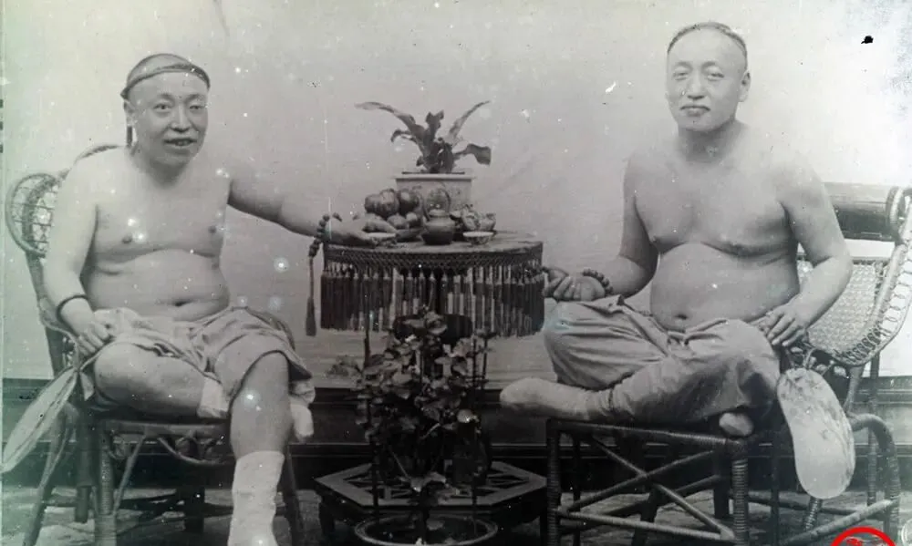 这两位上身光溜溜的坐在藤椅上,桌上摆着瓜果茶点和一把团扇,样子说随便是真随便,肚皮鼓鼓不遮不掩,屋里风一过,汗味散开就剩凉快,奶奶爱笑我,别嫌土,宅家本就图个自在,现在空调一开躺沙发上也算学了个皮毛,惬意是惬意,少了人情来往的闲话阵。
