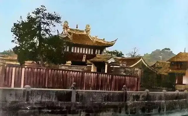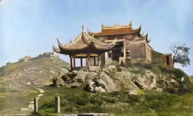 这山叫招宝山位于镇海区甬江出海口,半山腰这座寺庙就是招宝山寺,又叫宝陀禅寺。寺庙并不算大,门口有一座凉亭,飞檐翘角,十分醒目。远处山顶上有一些建筑。