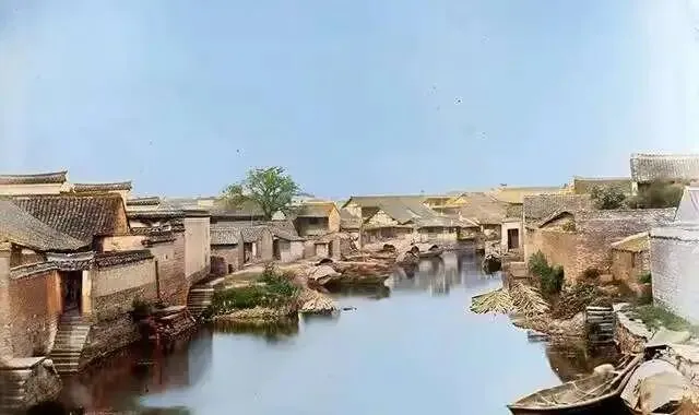 这是日湖北岸,那时候的湖水很清澈,湖的两岸是密密麻麻的低矮的瓦房,瓦房外面有石台阶可以走下去挑水。岸边还有两艘小木船。