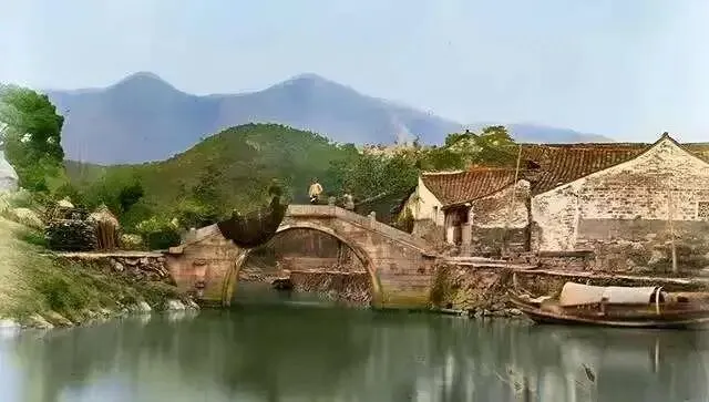 这里是一座石拱桥,桥下河水很是干净,桥上站着几个人,桥的右边有几间瓦房,瓦房岸边停着一艘小木船。远处是连绵不断的山峰。