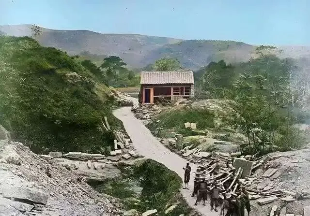 这里是一处采石场,一群工人正抬着石块走在山路上,路的两边堆放着石块。远处是高大的山峰。