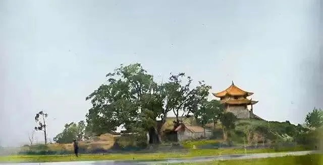 这里不知道是什么地方,半山腰上有一座亭子,周围种着一些树,山脚下那棵特别大,附近是荒地。