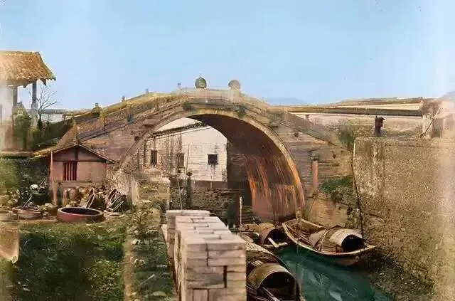 这是城内一座高拱桥,桥下停着几艘小船,左边岸边摆放着一排大砖头。
