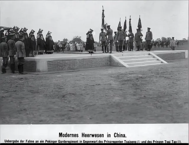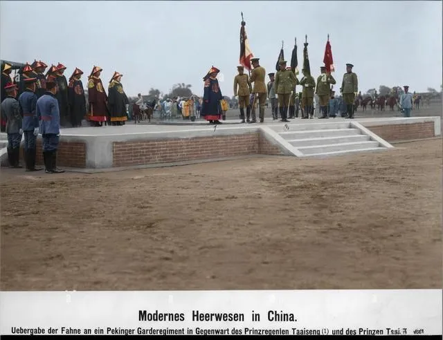 图中这一处高起的砖台叫授旗台,旗杆插在正中,前列的人马分成两边,军官戎装立定,后头一圈皇室亲贵穿着明黄红边的礼服,帽翅硬生生撑着脸面,台阶边缘的砖缝还新,地上却是风沙扑面,旗一落一扬,好看是好看,可你听见没有,远处练队的口号不齐,马蹄声也乱,仪式讲究派头,真刀真枪就不太经问了。