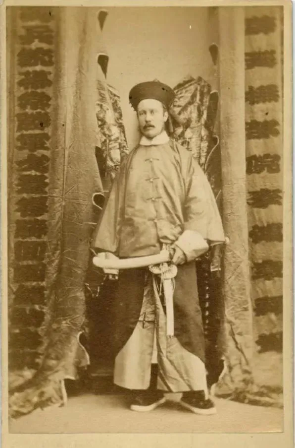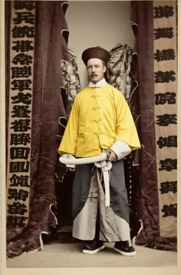 这个身着明黄褂子的叫黄马褂,是褒奖的穿法,袖口里兜着拐把刀形的礼器,帽子团团正正,脚下布鞋干干净净,背后挂着织金绫的幕布,照相馆摆的布景讲究一个富贵相,镜头里的人站得直,鼻梁打着冷光,可你注意到没有,衣襟下摆起了褶,腰间的系穗略显松垮,照片光鲜,线头却露了半寸,这就像那时的官声,远看体面,近看见底。