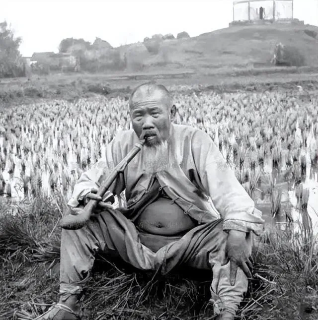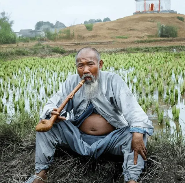 这个倚在田埂上的人手里拿的是旱烟枪,烟锅是葫芦做的,杆子长到能当拐杖,衣襟松开,肚子鼓鼓的,裤管卷到小腿肚,鞋上粘着泥,背后是刚插下去的秧苗,一水的嫩绿,坐久了腿麻,他就把烟袋锅往地上一磕,哐当一声,田间的风从耳根钻进去,呼啦一下把汗吹凉了。