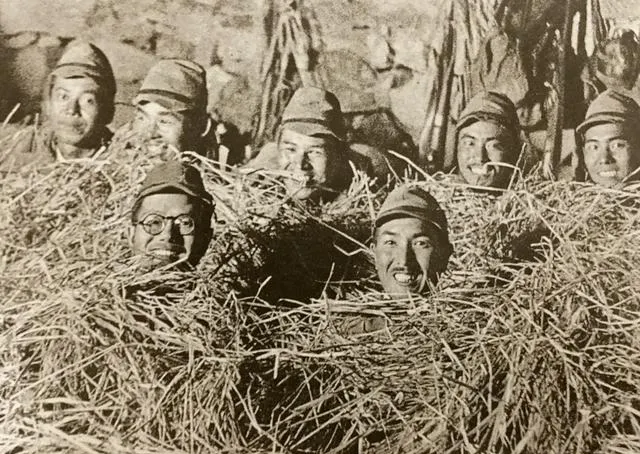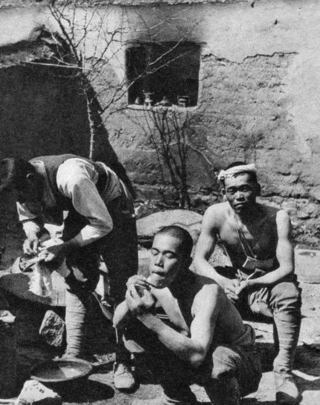 这一组是在民宅院里,盆往地上一扔,有人刮胡子有人抽烟,墙皮脱落,窗洞里摆着小罐子,都是人家锅灶边的东西,他们占了就把自己当主人,村里男人被抓去挑担,女人躲在灶屋不敢走动。