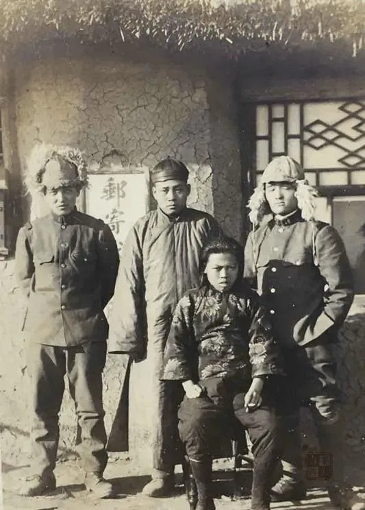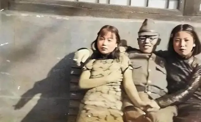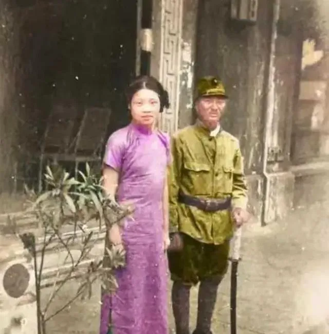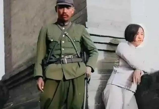 这男的穿军服站在女子旁边,旗杆抵在脚边,女人穿旗袍,站姿紧紧的,眼神却飘,你要问她愿不愿意拍,能说吗,不敢说。