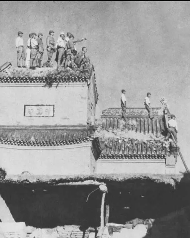 一群人登到庙宇屋脊上,瓦当一条条排着,他们在上头比划路线,嘴里叼着什么,下面的门匾被炮火震得斜了,谁家祖庙,经此一踏,香火就断了。