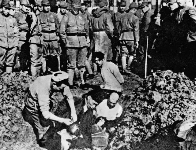 这张最让人心里发冷,坑里是一群被绑着的中国人,四周站满了他们的人,袖章盔帽一圈圈地把天都挡了,旁观不是看戏,是在等命令,等一个残忍的下文。