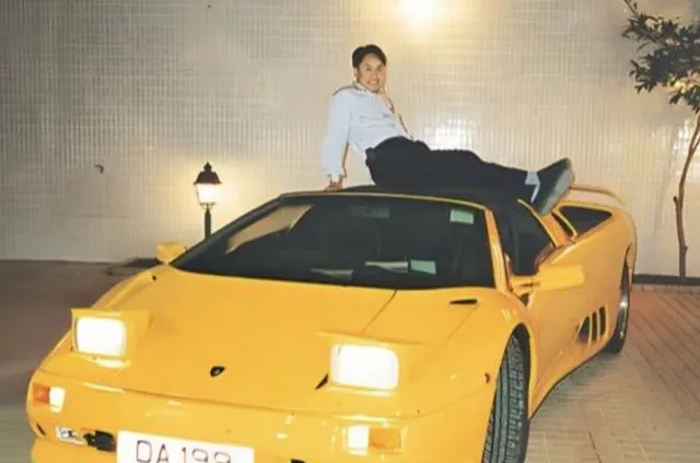 图里的这台黄色跑车一看就扎眼,灯罩是那种会“眨眼”的造型,他整个人半坐在引擎盖上,鞋尖翘着,背景是白瓷砖和院灯,姿势夸张,语气也不低调,后来大家都知道,他拿到钱最先换的就是这种响亮的排面。