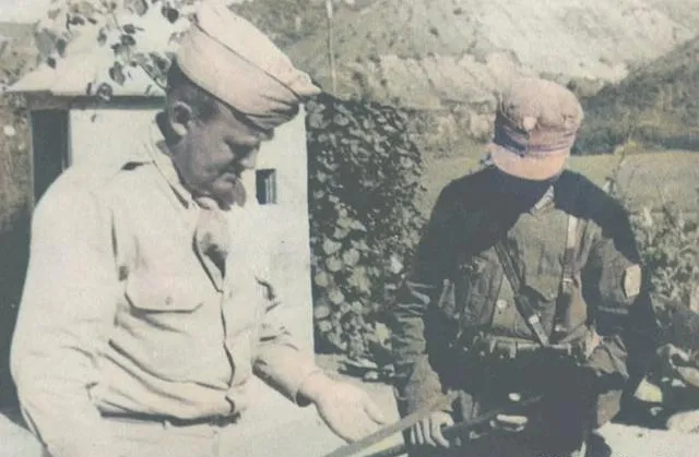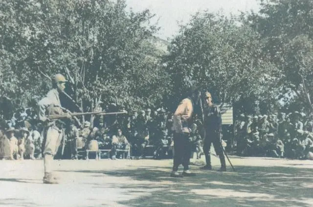 图里这套动作叫趴射,一个人贴在小土包上,胳膊肘扣住泥面,呼吸压到最低,旁边伸过来一只手比划角度,指头关节凸起,教的不是漂亮姿势,教的是别让枪口抖,那时候子弹紧张,能中一发就不浪费一发。