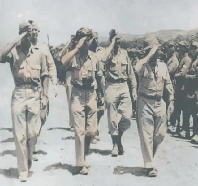 图中这片土坡叫见证地,说大不大,说小不小,一溜人站成弧形,浅色军装和卡其布挤在一起,袖口磨得发亮,笑意却不含糊,站在前排的几位,肩背微向里收,像把风口让给客人,阳光直直打下来,面庞全是硬朗的明暗关系。