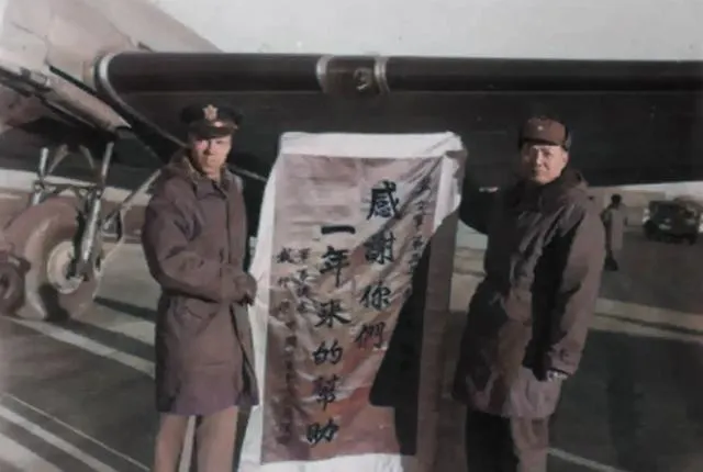 这块布叫谢意,笔画直来直去,风把下沿吹得微抖,机翼压在头顶,阴影像一把大伞,两个人抓着布边,棉大衣鼓着,脚下油漆线把停机位框得利落。